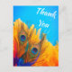 Diseño fantástico y elegante con características de escritura elegante, tarjeta postal de agradecimiento perfecta. El diseño presenta plumas de pavo real vivas sobre montones de plumas amarillo-naranja sobre fondo azul. Personalice la parte posterior de la tarjeta postal con sus nombres, su dirección de devolución y un mensaje de agradecimiento. Alternativamente, deje la sección de la plantilla del mensaje de agradecimiento en blanco para escribir a mano una nota personalizada y reflexiva en cada tarjeta después de que lleguen. Estas tarjetas se pueden usar para una boda, una fiesta de despedida de soltera o cualquier evento especial, ¡vas a amar esto!.