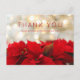 Una tarjeta de agradecimiento de Navidad con una fotografía festiva de la temporada que presenta un ramo de poinsettias rojas a lo largo de la parte inferior. Luces doradas brillantes de bokeh en el fondo. Mensaje personalizado en la parte posterior.
