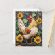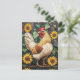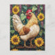 Pollo encaramado frente a la vegetación, girasoles y glicinia morada.