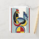 Una versión abstracta art decó de una gallina sentada en un huevo. Colorido en rojo, azul y amarillo