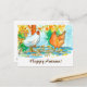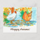 Una postal del "otoño feliz" de dos amigos de gallinas que buscan cerca de matorrales con hojas cambiantes para la temporada de otoño con colores brillantes de otoño de naranja, amarillo y verde dibujado con marcador y pintado con acuarela.