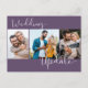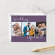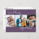 Actualización de postales de Boda morado y blanco personalizada con tus fotos y tu mensaje de postergación de boda. La plantilla de fotos está preparada para que añadas 3 de tus fotos favoritas en la parte delantera. Tus fotos están enmarcadas con las palabras "Actualización Boda", escritas a mano en tipografía de botas. También puede personalizar la parte posterior de la postal con su dirección de retorno, mensaje personalizado y nombres. Una forma alegre y reconfortante de actualizar a los huéspedes y mantenerlos al tanto con tu cambio de planes.
