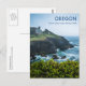 Una dramática captura del paisaje de la casa encaramada en lo alto de los acantilados barizados por el viento en el Otter Escudo Loop, cerca de Rocky Creek en la costa de Oregón. Las olas de los océanos azules se extienden hacia tierra desde el lejano horizonte tormentoso, rompiendo contra la base accidentada negra de los acantilados rocosos. En la cima del escarpe, entre frondosos pastos verdes y escondidos en altos pinos que protegen del mal tiempo, se encuentra una casa gris de dos plantas, ventanas y una chimenea prominente frente al mar. La imagen está enmarcada con el grueso y usual arbusto verde y los árboles de baja altitud esculpidos por el viento que son indígenas en esta zona.