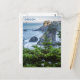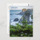 La luz del sol de la mañana tocando una parte accidentada de la costa de Oregón en el punto de vista de Arch Rock Roadside, cerca de Brookings. Varios estanques con sombra se encuentran a la salida de las aguas del océano acuático, rodeados de surf a sus pies y adornados con pinos altos en sus picos soleados. Pequeñas pilas de agua salían de las aguas soleadas en el lejano horizonte nebuloso que gradualmente se fusiona en un cielo azul claro. El primer plano está dominado por verduras y hierbas de color verde oscuro, salpicadas por un conjunto de flores silvestres de iris violeta y amarillo.