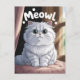 A delightfully charming, cartoon-style illustration of a fluffy white Persian cat with big, expressive green eyes. This cute feline is sitting comfortably on a soft cushion by the window, bathed in sunlight. The text "Meow!" floats above its head, capturing its gentle plea for attention.