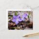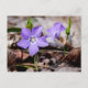 Un par de flores moradas periwinkle (Vinca menor) floreciendo en el suelo del bosque.