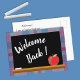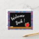 Una postal simple pero eficiente para dar la bienvenida a sus estudiantes de vuelta a la escuela este año . En la parte delantera hay una pizarra negra con una tiza blanca y una manzana roja. El fondo es de color azul y violeta. En la parte de atrás está el texto con toda la información necesaria para el primer día de clases . Personalizar usando la plantilla . También hay un espacio para el nombre del profesor y el número de la habitación. © Ilustraciones ArianeC