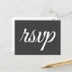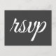 Esta sencilla y elegante tarjeta RSVP muestra el mensaje "rsvp" en la parte delantera en texto blanco sobre un fondo gris oscuro. La parte posterior incluye un formulario RSVP de personalizable y una dirección personalizada.