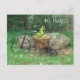 Hola, está escrito en blanco. Flores rosa bonito en una pequeña bicicleta de jardín negro a la antigua en el césped con rocas de roca de roca y árboles en el fondo. NOTA: Ir al tipo de papel y seleccionar postales semibrillantes antes antes de desproteger. Fotografía original de TamiraZDesigns.