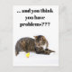 Braune, getigerte Katze schaut intersiert kleines "Küken" y (Stoff). Symblisch mit Humor als Lebensweisheit, dass es immer jemand gibt, der mehr Probleme gorra. Humorvolle Aufmunterung, dass alles halb so schlimm ist.