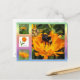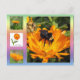 Pantalla de Calendula. A la izquierda de la tarjeta hay tres pequeñas imágenes de flores de caléndula. La mayor parte de la carta muestra una imagen más grande de una flor de caléndula con una abeja recolectando polen/néctar. Todas las imágenes están enmarcadas con rayas de arco iris horizontales.