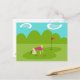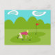 Esta postal retro golfer es más divertida que un día en los verdes. El estilo de los años 60, el diseño minimalista no es nada del otro mundo. Cuenta con un solitario golfista en un frondoso y verde callejón. El golfista moderno de mediados de siglo está haciendo una verdadera declaración de moda en sus elegantes, elegantes pantalones de golf y camiseta de fucsia. El guerrero rubio, en forma, del fin de semana está de manos y de rodillas intentando alinear un tiro. O tal vez está intentando darle a la pelota un empujón en la dirección del agujero. ¿Realmente importa? A su lado, vemos un solo club de golf. Enfrente de él está el hueco esquivo, con una bandera roja, que le está burlando. El fondo está formado por una línea verde de árboles personalizados, un cielo acuático y dos nubes blancas con forma de riñón. Este diseño es seguro que será un agujero en uno con tu profesional de golf favorito.