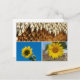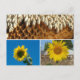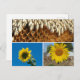 Amor a los girasoles. La imagen superior es la cabeza de una flor seca que muestra semillas y células vacías. La parte inferior izquierda muestra una flor madura contra un cielo azul. La esquina derecha es una flor llena de edificios y árboles en segundo plano.