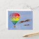Balón de aire caliente y dos pájaros vuelan en un cielo azul con nubes tenues. El globo tiene rayas arcoiris de rojo, naranja, amarillo, verde y azul. Los pájaros tienen alas marrones. La parte trasera de la tarjeta tiene el título "Come Fly With Me".