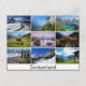 Postcard with a collage of nine photos from landscapes of the alpine country Switzerland, like Matterhorn mountain, Bernese Oberland, Wengen, Lauterbrunnen, Lavertezzo, Ticino, Oeschinensee Lake and Grimentz with a white border and the text: 'Switzerland'.