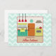Una postal con el ilustracion de una cocina de inspiración retro, decorada con un esquema de color rojo, turquesa, amarillo y naranja. Personaliza el texto con tu nombre. El fondo es azul claro con zags de zig. El lado opuesto está en blanco.