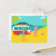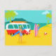 Todos los días se puede pasar un día en la playa con esta tarjeta postal Retro Surfer Couple. El estilo de los años 60, con un diseño de arte minimalista, cuenta con una pareja encantadora de divertirse, adoradora del sol, que busca emoción, lista para coger una ola. El entorno es un oasis tropical insular con una playa de arena dorada, con olas, palmeras verdes, un océano azul pavo real y un cielo acuático. A lo lejos, podemos ver una verde azulada isla volcánica, que por el momento está latente. De vuelta en la playa, no podemos evitar notar el dulce viaje que llevó a nuestra pareja a su destino de ensueño. Es una furgoneta moderna de mediados de siglo, roja y blanca con una tabla de surf naranja y amarilla atada a la parte superior. Aunque no podemos estar seguros, es justo suponer que en el interior de la camioneta hay mucha afeitación, moqueta de chispa y olor a incienso. Surfer Dude y Beach Babe tienen tanques con besos de sol, pelo blanqueado de sol y trajes de baño azules con motivos tiki. Surfer Dude sostiene una tabla de surf azul. Beach Babe está al lado de su tabla de surf rosa de dos tonos. En las inmediaciones hay una pelota de playa roja y blanca que espera cumplir su destino de verano. ¡Atrapa algunas olas y comparte amor con este diseño kitsch de verano!