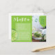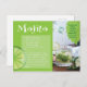 Postales de receta para el Mojito, un tradicional cóctel cubano de albónbol hecho con ron, menta y lima. La tarjeta incluye una foto de una botella vertiéndose en un vaso con menta y cal, gráficos de trozos de cal y hoja de menta y la receta.