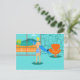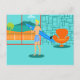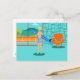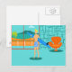 Cada día puede ser un día en la playa con esta postal de Retro Surfer Dude. El diseño de arte minimalista, al estilo de los años 60, cuenta con un tipo dorado, rubio y surfista listo para tomar una ola. Nuestro surfista en forma mira al océano a través de las puertas correderas de cristal de su casa frente a la playa. Está parado en su sala de estar de color agua. Podemos ver un aqua y turquesa, una pared de piedra y una moderna silla naranja de mediados de siglo. En el lado opuesto de la puerta de cristal se ve un patio. Más allá, hay una playa de arena dorada, palmeras balanceadas, un océano azul pavo real y un cielo acuático. A lo lejos, podemos ver una verde azulada isla volcánica, que por el momento está latente. Surfer Dude sostiene una tabla azul y lleva pantalones cortos azules con estampado de tiki. ¡Atrapa algunas olas y comparte amor con este diseño kitsch de verano!