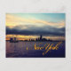 Una postal con el perfil del centro de Manhattan desde el agua, con un barco escalador en primer plano.