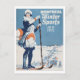 Cartel de época que anuncia deportes de invierno en colores de coral, marina, azul polvoriento y blanco. Esquiador con un paisaje de baja pendiente de nieve.