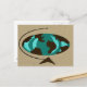 Viaja por el mundo con esta postal de arte de globo moderno de mediados del siglo XX. El diseño frontal presenta un globo óvalo abstracto con continentes de grano de madera. Los océanos están en tonos verde azulados y turquesa. El globo está en un soporte triangular de madera y todo el mundo está sobre un fondo de trigo.