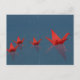 Una familia de grúas de origami rojos flota a través del agua residual de una piscina mientras las gotas de lluvia se deslizan alrededor de ellas.