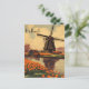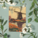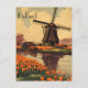 poster de viajes vintage de los Países Bajos, Holanda, con tulipanes naranjas, molino de viento y una casa en el agua