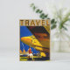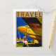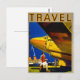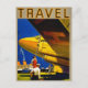 Poster de viaje vintage restaurado y mejorado digitalmente, que muestra a una mujer, un maletero de equipaje y otros parados cerca de un avión. En el fondo hay un transatlántico y un automóvil. Se han eliminado las inperfecciones. Colores corregidos. Imagen cortesía de la Biblioteca del Congreso.