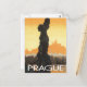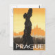 Praga, Checoslovaquia escena desde un poster de viajes vintage con estatua en primer plano y en segundo plano, con el nombre de Praga en letra deco en la parte inferior.