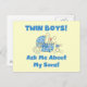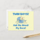 A la orgullosa nueva madre y padre de los bebés mellizos les encantará este lindo diseño que incluye dos conejitos de niños y texto azul que dice "¡Niños gemelos! ¡Pregúntame Por Mis Hijos!" Camisetas gemelas, tarjetas, botones, imanes, bolsas, ratones y otros!