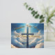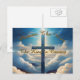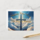 Cruz dorada azul entre nubes esponjosas con diseño tipográfico.