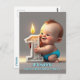 La foto muestra el primer cumpleaños de un bebé varón. El bebé está abrazando una vela encendida para celebrar su primer año de vida. El niño tiene una gran sonrisa. Hagamos que esta fiesta sea inolvidable.
