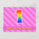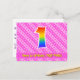 El frente de este diseño de tarjeta postal de cumpleaños divertida y animada presenta un número grande "1" con un patrón inspirado en el gradiente del espectro del arcoíris, junto con el mensaje "Feliz cumpleaños número 1", y un nombre de destinatario editable. La parte delantera tiene además un patrón alegre a rayas rosa claro y rosa oscuro que contiene formas de corazón. La parte trasera presenta un mensaje de felicitación de cumpleaños personalizado, o quizás podría estar despejada y dejada en blanco si se desea escribir un mensaje a mano. Una tarjeta postal de cumpleaños personalizada como esta podría ser una forma divertida de reconocer el primer cumpleaños de alguien. Las tarjetas postales como esta también podrían utilizarse para invitar a los invitados a una fiesta de cumpleaños o celebración que se organice para alguien que está cumpliendo 1 año.