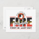 Bomberos con hacha en el escudo de bomberos con fuego en llamas, ¡INCENDIO y texto RESCATE! ¡Orgulloso, fuerte y valiente texto superior con el PRIMER EN ÚLTIMO LUGAR! ¡Gran regalo de lucha contra incendios!