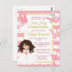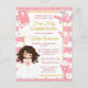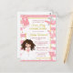 Chica de pelo de brunette de color rosa sagrado diseño de primera comunión con fondo rayado rosa y Relieve metalizado dorado confetti. Gráficos de Mujka y KlouiseDigiArt en Etsy.