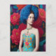 Imagen de una princesa con vestido decorativo azul y peluca azul afro. Esta es una obra de arte generada por IA con un tema floral.