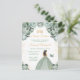 Esta elegante y glamurosa invitación de cumpleaños para dulces dieciséis presenta a una hermosa princesa con cabello castaño en un vestido de gala verde salvia. El texto combina letra manuscrita y fuentes modernas sans serif para un look clásico y sofisticado. Los arreglos florales, la mariposa y el confeti dorado crean la mezcla perfecta de rústico y chic.