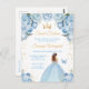 Esta elegante y glamurosa invitación de cumpleaños de sweet sixteen presenta a una hermosa princesa con cabello castaño en un vestido de baile azul claro. El texto combina la escritura a mano y las fuentes modernas sans serif para un aspecto clásico y sofisticado. Los arreglos florales, la mariposa y el confeti dorado crean la mezcla perfecta de rústico y chic.