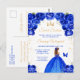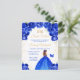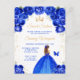 Esta elegante y glamurosa invitación de cumpleaños para dulces dieciséis presenta a una hermosa princesa con cabello castaño con un vestido de gala azul real. El texto combina la escritura a mano con fuentes modernas sans serif para un aspecto clásico y sofisticado. Los arreglos florales, la mariposa y el confeti dorado crean la mezcla perfecta de rústico y chic.