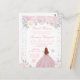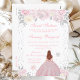 Esta elegante y glamurosa invitación de cumpleaños dieciséis de invierno presenta a una hermosa princesa con cabello rojo marrón y piel clara en un vestido de baile rosa. El texto combina la escritura a mano y las fuentes modernas sans serif para un aspecto clásico y sofisticado. Las disposiciones florales, los copos de nieve y el confeti plateado crean la combinación perfecta de rústico y chic.