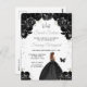 Esta elegante y glamurosa invitación de cumpleaños sweet sixteen presenta a una hermosa princesa con cabello castaño en un vestido negro de gala. El texto combina letra manuscrita y fuentes modernas sans serif para un look clásico y sofisticado. Los arreglos florales, la mariposa y el confeti plateado crean la mezcla perfecta de rústico y chic.