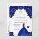 Esta elegante y glamurosa invitación de cumpleaños sweet sixteen presenta a una hermosa princesa con cabello oscuro en un vestido de gala azul oscuro. El texto combina letra manuscrita y fuentes modernas sans serif para un look clásico y sofisticado. Los arreglos florales, la mariposa y el confeti plateado crean la combinación perfecta de rústico y chic.