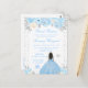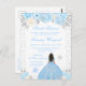 Esta elegante y glamurosa invitación de cumpleaños de dieciséis años de invierno presenta a una bella princesa con cabello castaño y piel oscura con un vestido de baile azul. El texto combina la caligrafía manuscrita y las fuentes sans serif modernas para un aspecto clásico y sofisticado. Los arreglos florales, copos de nieve y confeti de plata crean la mezcla perfecta de rústico y elegante.
