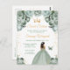 Esta elegante y glamurosa invitación de cumpleaños sweet sixteen presenta a una hermosa princesa de piel oscura con un vestido de baile en verde salvia. El texto combina letra manuscrita y fuentes modernas sans serif para un aspecto clásico y sofisticado. Los arreglos florales, la mariposa y el confeti dorado crean la combinación perfecta de rústico y chic.