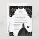 Esta elegante y glamurosa invitación de cumpleaños de dulce dieciséis presenta a una hermosa princesa con piel oscura en un vestido de gala negro. El texto combina letra manuscrita y fuentes modernas sans serif para un look clásico y sofisticado. Los arreglos florales, la mariposa y el confeti plateado crean la mezcla perfecta de rústico y chic.