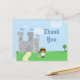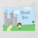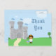 ¡Esta fiesta de cumpleaños de este lindo muchacho Gracias postal tiene un tema de Encanto del Príncipe Real! Hay un castillo gris en el fondo con tres banderas azules ondeando en la parte superior. En la parte inferior, hay un príncipe étnico afroamericano que lleva una corona de oro con una chaqueta azul. En el suelo al lado del príncipe, hay una rosa roja y un escudo. En el lado derecho, gracias está escrito. En la parte posterior, puede personalizar el mensaje de agradecimiento o dejarlo en blanco para escribir a mano en su mensaje en casa. Gráficos de Zenware Designs en MyGrafico.com