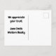 ¿Busca una forma única de felicitar a su cliente por la compra de su hogar? La parte frontal de esta postal presenta un boceto vintage en blanco y negro de una distinguida casa junto con las palabras "Bienvenido a casa" que aparecen en el techo. La parte posterior de esta postal incluye palabras de agradecimiento, su nombre y el nombre de la compañía de bienes raíces. Todo el texto se puede personalizar fácilmente para satisfacer sus necesidades.