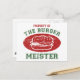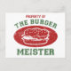 Perfecto regalo para el maestro parador de hamburguesas en tu casa. Diseño angustiado en rojo y verde con pan de semilla de sésamo y hamburguesa. El texto dice PROPIEDAD DEL MEISTER DE LA QUEMA. Gran regalo para el Día del Padre, el Día de la Madre o un cumpleaños. ¡En camisetas para bebés, niños y adultos, tazas, gorras, bolsas de té y más! ¡PinkInkArt original!