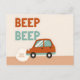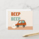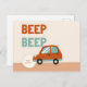 Esta encantadora postal presenta una deliciosa celebración de un hito significativo: pasar un examen de manejo. La parte delantera de la postal está dominada por una divertida y sobredimensionada exclamación tipográfica "BEEP BEEP" en tonos alternados de cálido rústico y verde azulado suave, evocando el sonido de una bocina de auto de una manera amigable y atractiva. Debajo de esta proclamación jubilosa se encuentra una representación estilizada y personalizado de un auto, representado en una alegre sombra de naranja que transmite una sensación de emoción y energía. El diseño del coche es sencillo pero encantador, con bordes redondeados y una estética minimalista que sugiere facilidad y accesibilidad, perfecta para un nuevo conductor. Se posiciona como si estuviera rodando casualmente a lo largo de un camino mutado de bronceado, con su neumático delantero juguetonamente pateando una pequeña nube que contiene el mensaje "¡Buen trabajo en tu prueba de conducción!" La elección de un tipo de letra liviano y aireado para esta nota de felicitación añade un toque personal, como si un soplo de aire del propio auto estuviera transmitiendo el mensaje. El fondo es un gradiente relajante de cremas y beiges, que recuerda a un cielo despejado del alba, que ofrece un lienzo en blanco que sugiere las infinitas posibilidades que vienen con la recién descubierta libertad de conducir. El diseño general de la postal es uno que equilibra la alegría y la sencillez, lo que lo convierte en una forma ideal de transmitir felicitaciones y buenos aplausos al orgulloso nuevo conductor. Ya sea que esté enfundado en un tablero de anuncios, magnetizado a una nevera, o escondido en un libro de recortes, esta postal sirve como un delicioso recuerdo que conmemora un logro memorable. No es sólo un mensaje, sino una celebración visual de la independencia, el logro y los caminos abiertos por delante.